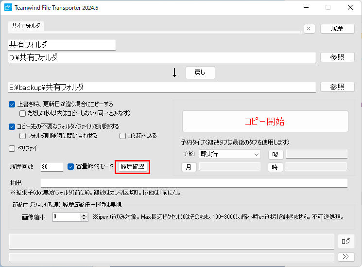 更新が無いファイルは、コピーではなく移動し履歴管理するモードです。
